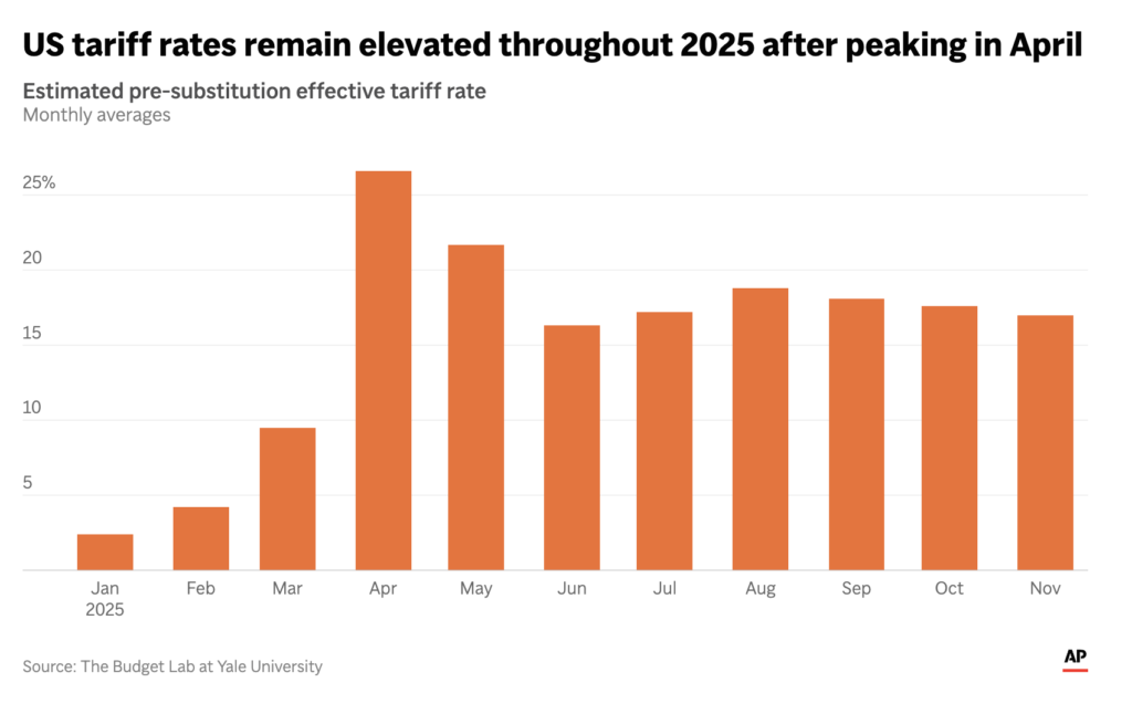The bigger point is what happened after the initial spike. Tariffs didn’t just flare up and fade. They stayed elevated through the rest of the year, forcing businesses to operate in a new reality: